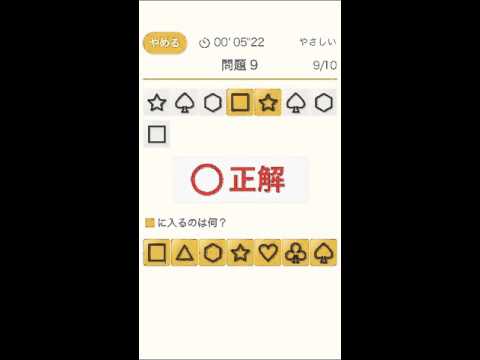あそんでまなぶ!シリーズのAndroidアプリです。図形推理です。 図形が同じ繰り返し順で並んでいて、空欄に入る図形を選ぶアプリです。 10問出題されます。100点取れるかがんばってみてください。 ランキングは、点数のAndroidアプリです。多い順かつタイムのAndroidアプリです。早い順になります。 お友達どうし、親子対決で楽しんでください。