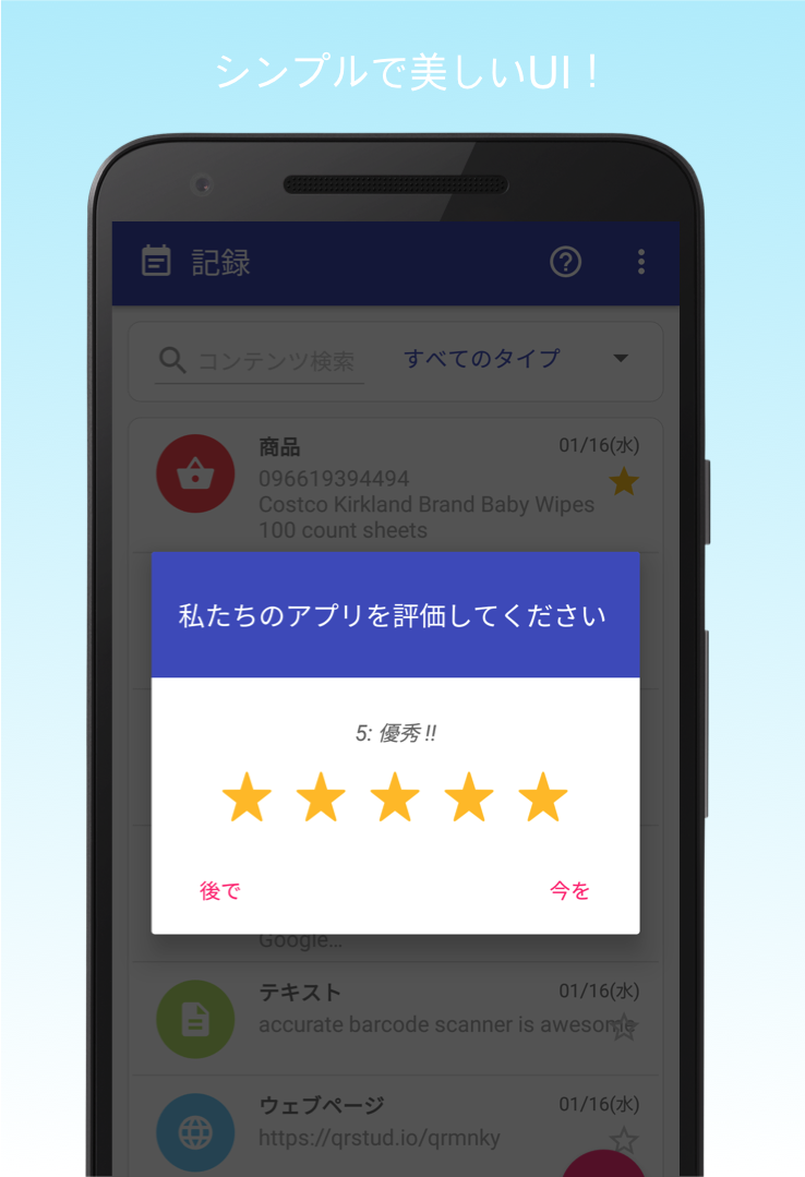 モダンUI 1.新しいマテリアルUI:昔ながらのAndroidアプリです。Android UIはありません 2. UIでのAndroidアプリです。カラフルなレイアウトとアニメーション 3.コンテンツ、カレンダーのAndroidアプリです。日付、レコードリストのAndroidアプリです。バーコードタイプによる強力な検索