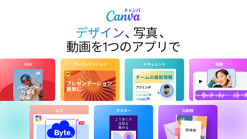 Canvaで簡単作成!グラフィックデザインのAndroidアプリです。作成、画像や動画のAndroidアプリです。編集に活用できるオールインワンアプリです。