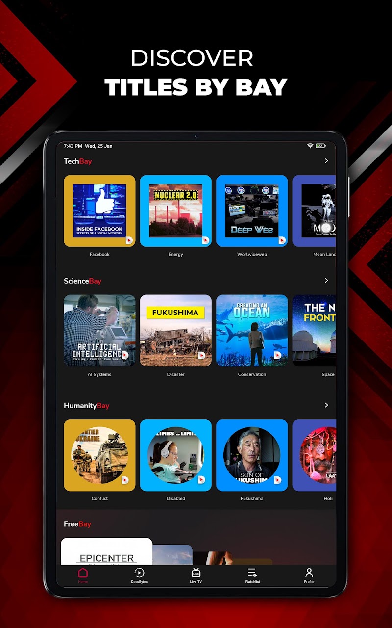 Androidアプリです。増え続けるドキュメンタリーコレクションは、犯罪、自然、伝記、文化、旅行、歴史、音楽、スポーツ、人類、冒険、政治など、さまざまなカテゴリにまたがっています。