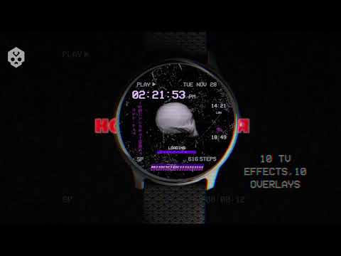 ホラー / PSX スタイルをテーマにしたウォッチフェイスです。アニメーション化された低ポリ頭蓋骨と VHS 静的ノイズ効果が含まれています。