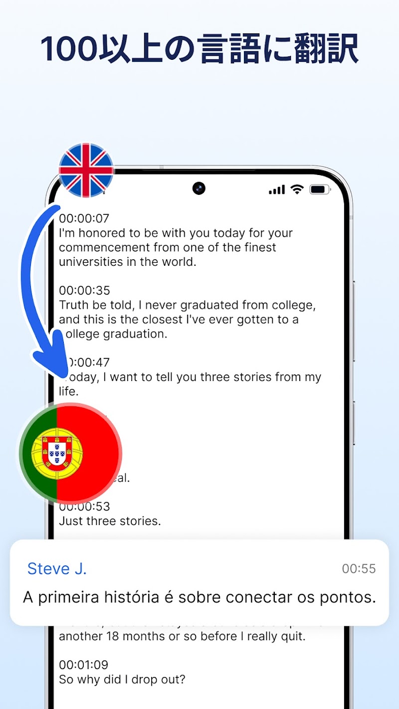 Androidアプリです。さまざまな形式をサポートしながら、ボイスメモを高精度で簡単にテキストに変換します。会議、インタビュー、講義などに最適です。