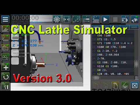 Androidアプリです。3次元シミュレーションモデルは、CNCシステム、12ポジションタレットヘッド、3爪チャック、テールストック、潤滑油および冷却液供給システム、その