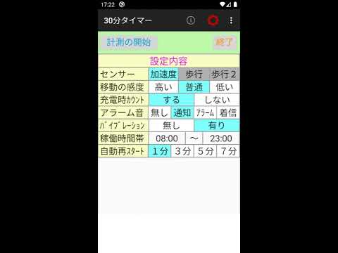 オプションメニューで、計測時間(30・45・60・75・90)のAndroidアプリです。選択、ホワイトリストへのAndroidアプリです。登録、アラーム音量(最大音量に対する割合)のAndroidアプリです。選択ができます。