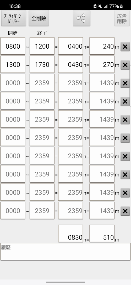 開始時刻と終了時刻から経過時間分、開始時刻と経過時間分から終了時刻を計算する簡単シンプルな時間計算電卓無料アプリ。10件同時に時間計算、時間計算結果のAndroidアプリです。合計計算、時間計算履歴。シフト勤務時間管理に。