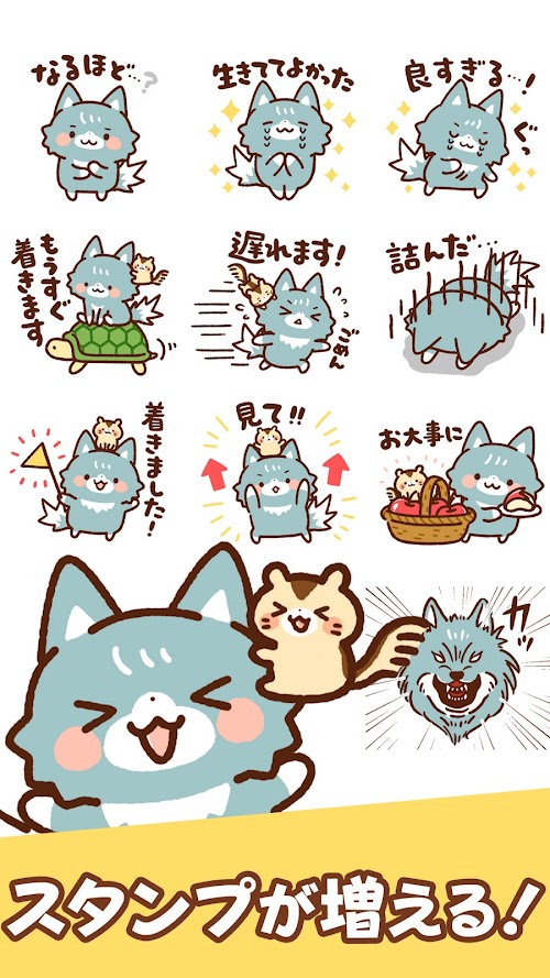 狼(おおかみ)や、ヤマネなどのAndroidアプリです。可愛い動物キャラクター達のAndroidアプリです。無料スタンプアプリです。 アプリからすぐにトークへスタンプを送信する事が出来ます。完全無料です。 登録不要です。 可愛いスタンプ画像が多数収録されています。まるで顔文字を貼り付けるようにトークルームへ喜怒哀楽のAndroidアプリです。スタンプを貼り付けられます。トーク中に画面上から通知バーを引き下げ、そこからスタンプを送れる機能(ツール)が備わっています。